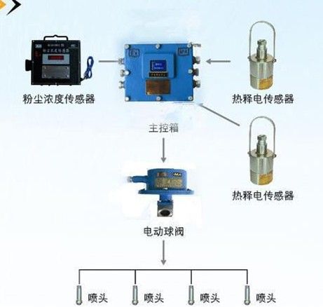 該裝置由微電腦程序化自動控制,粉塵濃度低于粉塵濃度傳感器設(shè)定值時,裝置不工作;當粉塵濃度超過粉塵傳感器設(shè)定值時,粉塵濃度傳感器將信號送入主控箱,主控箱即控制電動球閥開啟噴霧灑水降塵。當熱釋光控傳感器探測到過往行人時,將信號傳遞到主控箱,主控箱即控制電動球閥關(guān)閉,停止噴霧灑水;